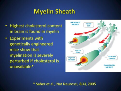The body produces this much cholesterol because it’s vital to the protection of the nervous system. The covering of nerves is called the myelin sheath, which is composed of cholesterol. The cell membrane is also composed of cholesterol, which plays a role in processing billions of bits of information and in allowing nutrients in and out of the cell.