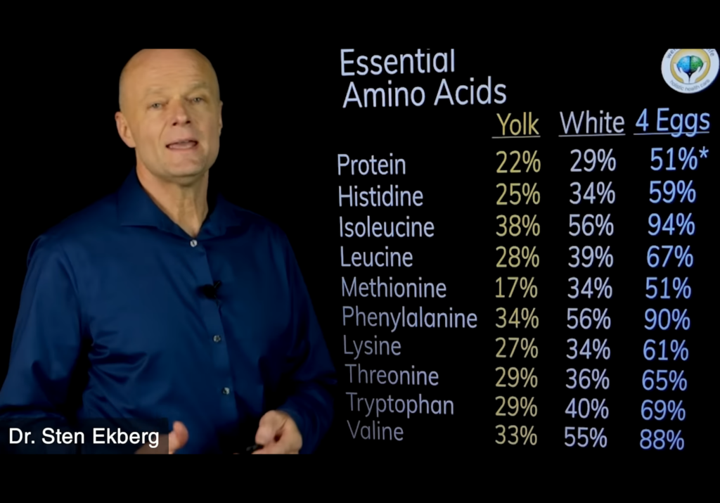 In comparison, protein from eggs have some of the highest utilizations rates, with 49% converted to tissue and 51% being converted to energy. This is also another reason why the eggs yolks should be consumed with egg whites, as the amount of essential amino acids go up significantly in percentage when the egg is eaten as a whole.
